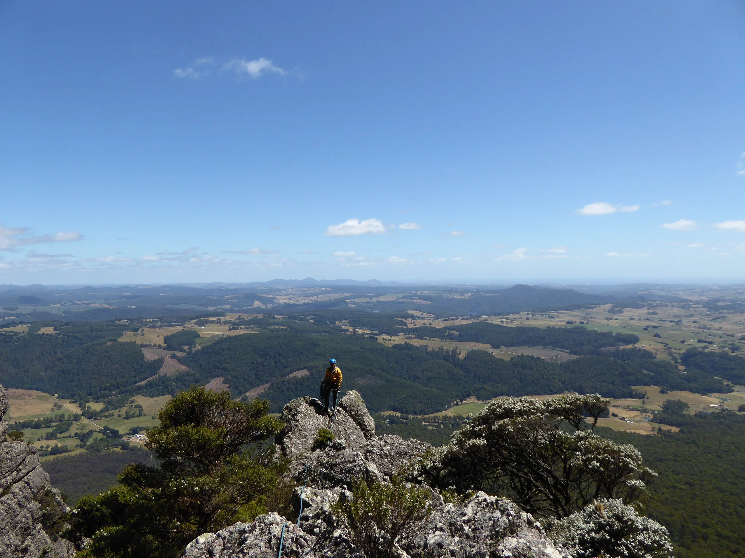 An amazing day out of multi pitch climbing on immaculate Conglomerate Rock. While the climbing is quite easy (Gr 12) at 350 metres this is a full day adventure. Expect up to 12hours return including the approach/return walk (1hr each way). Prior experience belaying a lead climber is required along with some abseiling background as the descent involves multiple abseils down a spectacular rainforest gully.